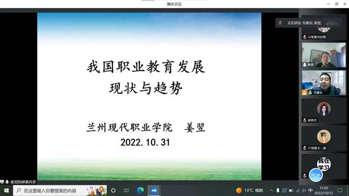 为帮助公司职业技术教育专业硕士研究生更全面地了解我国职业教育的现状和发展趋势、更好地定位自我、明确培养和成长方向,10月31日下午,金沙城js93线路检测中心特邀甘肃省职业教育专家、兰州现代职业公司高级讲师姜翌老师为公司职业技术教育专业硕士研究生和导师作了线上专题讲座。讲座由副经理孔维宝教授主持,公司100余名师生参加了线上学习和交流活动。