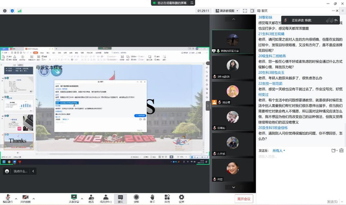 会议上,陈鹏老师从我的故事、家的故事、国的故事、个人经验四个方面展开讲述。他与同学们共同翻阅他的人生之书,鼓励同学们在这特殊时刻要相信前路光明,阴霾终会散去。他希望同学们学会尊重包容,学会爱国、爱己、爱人,在人生的道路上尽自己所能做到最好,不留遗憾。同时,在学有余力的情况下参加各种校园活动来提高自己。最后同学们提出了疫情期间学习方面的疑虑,陈老师进行了详细解答。