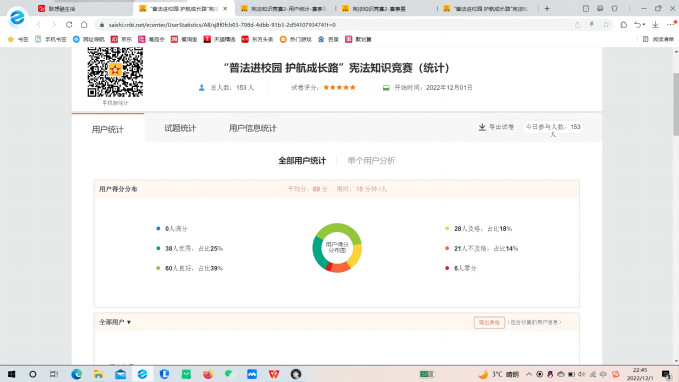此次竞赛分为扫码报名、参与答题、结果公示三个阶段,共计153位同学参加此次活动。根据答题得分和答题时长最终评选出一等奖3名、二等奖6名、三等奖9名、优秀奖12名。比赛过程中,系统会从题库中随机抽取40道题目供参赛者在规定时间内作答,严禁作答时有切屏和其他违规行为,从而确保比赛的公平性。在所有参赛同学答题结束后即会公布考题答案,方便同学们正确快速地了解与考题相关的宪法知识。