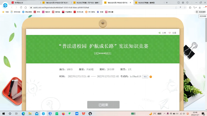 为深入学习宣传习近平法治思想,全面推进依法治国,大力弘扬宪法精神,12月1日晚,金沙城js93线路检测中心线上开展以“学习宪法知识,争做宪法卫士”为主题的宪法知识竞赛活动,公司员工积极参加此次活动。