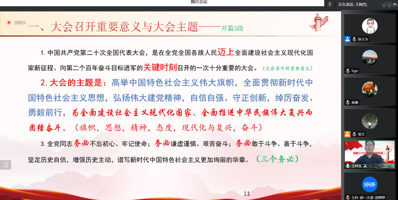 会上,王树亮副教授作了题为《党的二十大会议和报告要点》的专题辅导报告。报告紧扣党的二十大报告主题,对党的二十大会议要点、报告要点进行了解读,特别是对报告的主体结构和主要内容进行了细致梳理,分别从奋斗新时代,贯彻新思想,擘画新蓝图和启航新征程等方面,全方位解读了党的二十大的重大意义,系统阐述了党的二十大报告的丰富内涵。