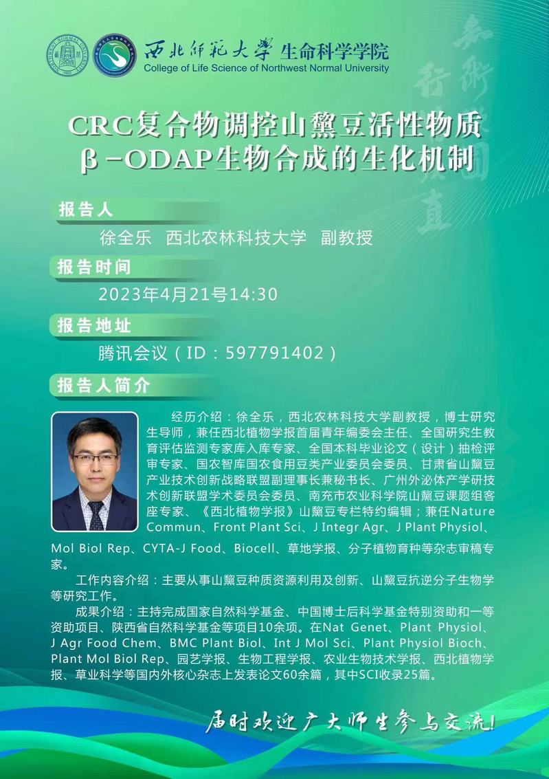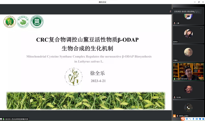 2023年4月21日下午,应金沙城js93线路检测中心的邀请,西北农林科技大学徐全乐教授在线为公司师生作了题为《CRC复合物调控山黧豆活性物质β-ODAP生物合成的生化机制》的学术报告。