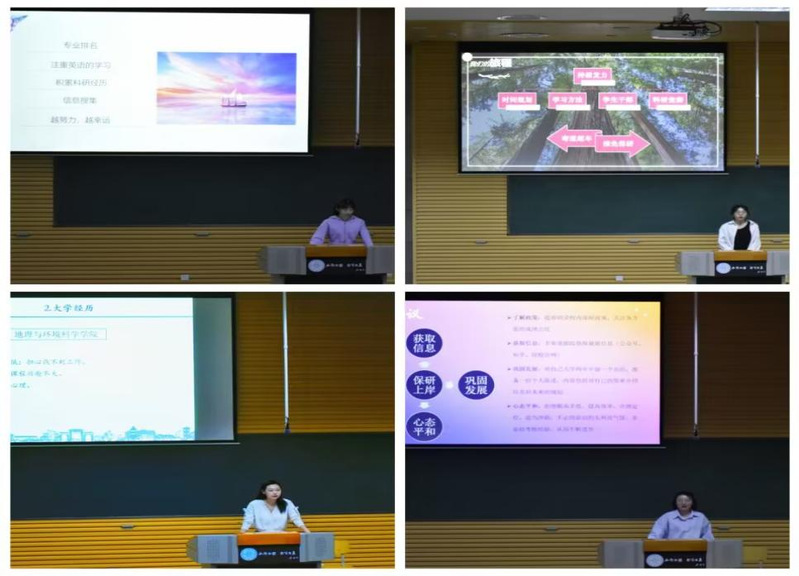 会上,四位同学分别从保研的前期准备、夏令营申请、科研能力的训练以及自己有效的学习经验等方面做了分享。夏靖萱给同学们讲述了自己的保研经历,对开始申请夏令营到公司成功录取的过程做了详细介绍,建议同学们早做准备,多投夏令营,多关注信息;庹顺羽在保研流程及加分内容等方面做了分享,建议同学们认真学习英语与专业课知识,不断地去丰富自己基础知识的储备;高维谦就自身经历,鼓励同学们积极参加比赛、科研项目,注重自身科研能力的培养,勇于试错,不断地锻炼自己;丁卓灵对保研录取类型进行详细的对比,对了解保研政策、获取有效信息、巩固发展、调节心态等方面做了讲解和总结。在提问环节,同学们踊跃发言,针对自己内心的疑惑和迷茫提出问题,四位分享人也对同学们的问题作出了耐心细致的答复。