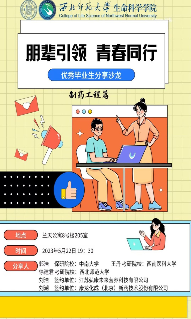为切实提高公司员工学习能力,帮助同学们深入了解保研、考研及就业现状,5月22日,公司开展了以“朋辈引领,青春同行”为主题的制药工程专业优秀毕业生分享会。此次会议由优秀毕业生郭浩、王丹、徐建军、刘浩、刘潮五位同学分享,由辅导员鲍海彤老师主持,2021级和2022级本科生代表参加学习。