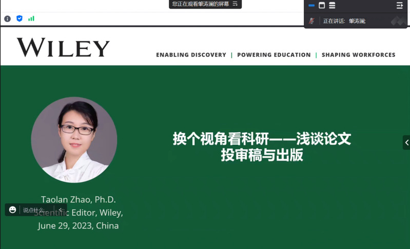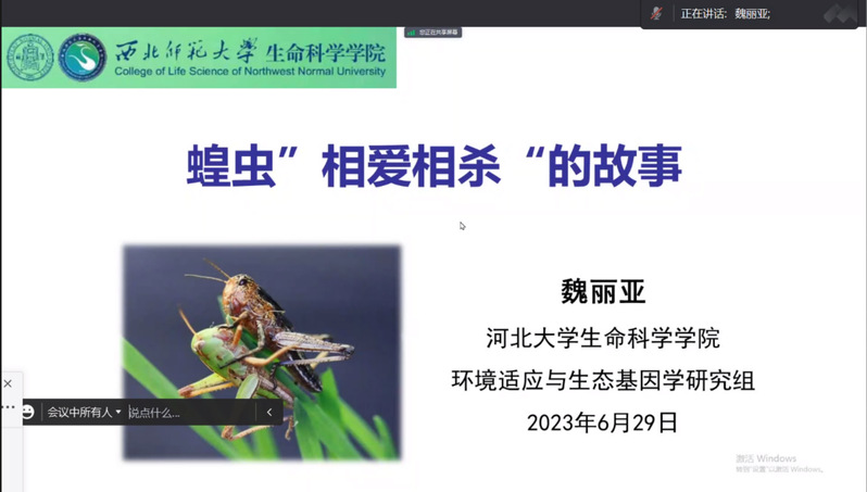 6月29日上午,应我院邀请,河北老员工命科学公司魏丽亚副教授和Wiley出版集团中国区生命科学部门科学编辑肇涛澜博士在线分别为公司师生作了题为《蝗虫“相爱相杀”的故事》和《换个视角看科研—浅谈论文投审稿和出版》的学术报告。