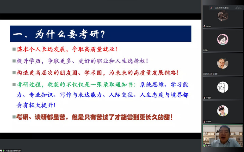 在互动环节,同学们积极提问,孔经理耐心解答,并鼓励同学们脚踏实地、精准定位,时刻保持高效率的投入和自强不息的坚定信念,扎实做好考研复习。