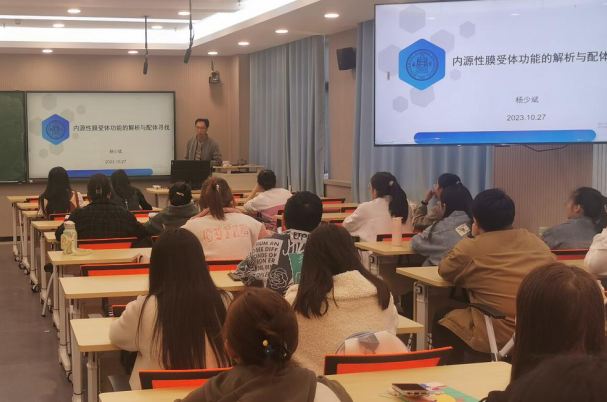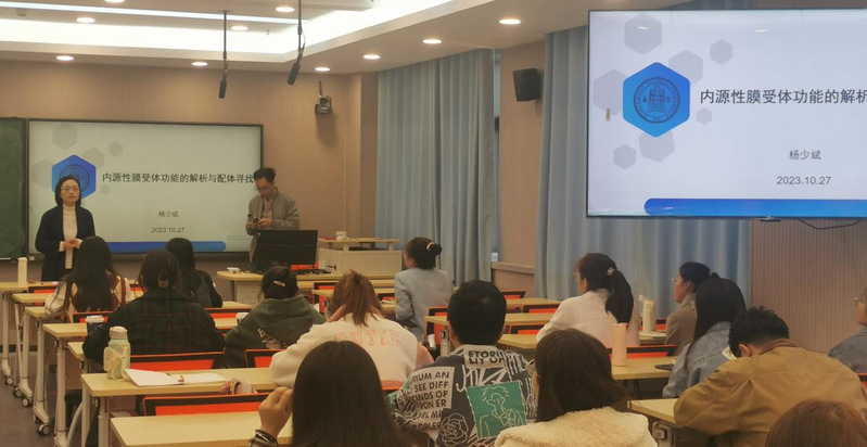 在报告环节中,公司青年教师杨少斌副教授、周峰副教授分别作了精彩的学术报告。杨少斌副教授以《内源性膜受体功能的解析与配体寻找》为题作学术报告。他指出阿尔兹海默症(AD)是一种最常见的、不可逆的、与年龄相关的神经退行性疾病,会导致患者运动、记忆、认知等功能障碍。报告重点介绍了杨少斌团队在AD动物和细胞模型中所研究的小分子多肽药物基于离子通道、G蛋白偶联及蛋白修饰介导的生理活性机制,相关研究成果为阿尔兹海默症的治疗提供了重要基础和科学依据。