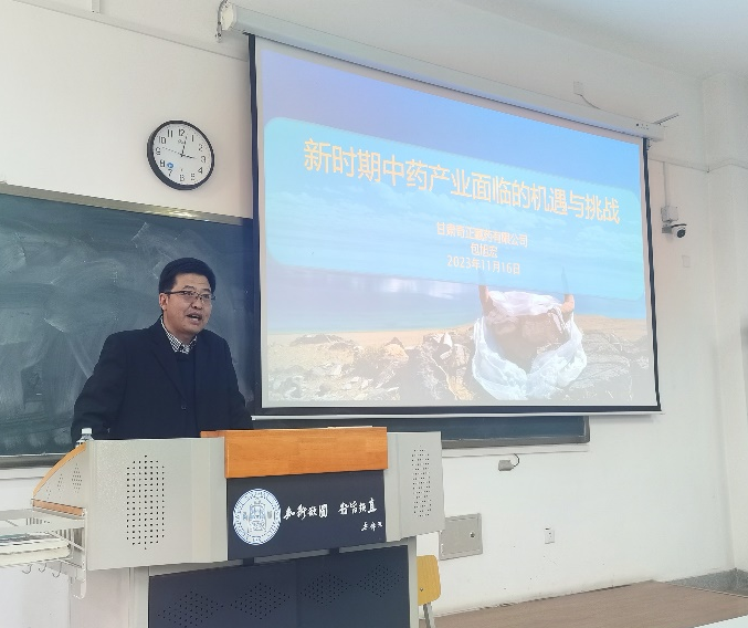 2023年11月16日下午,应公司邀请,甘肃奇正藏药有限公司正高级工程师包旭宏为生物技术与制药工程相关专业研究生、本科生和专任教师作了题为“新时期中医药产业面临的机遇和挑战”的专题报告。本次报告会由公司副经理孔维宝教授主持,100余位师生参与此次报告会,进行了现场学习和交流。