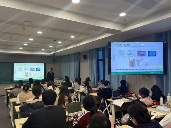 白仲添研究员作了题为“肿瘤特异性靶点筛选及分子靶向抑制剂研发”的学术报告。报告中,白仲添研究员结合自身在医院的临床研究背景向在场师生系统介绍了如何实现特异性抗癌靶向药物的研发过程,以核苷酸代谢途径、细胞周期为切入点,并举例说明细胞周期中特异性调节因子的筛选过程、特异性靶点抑制剂的开发应用。