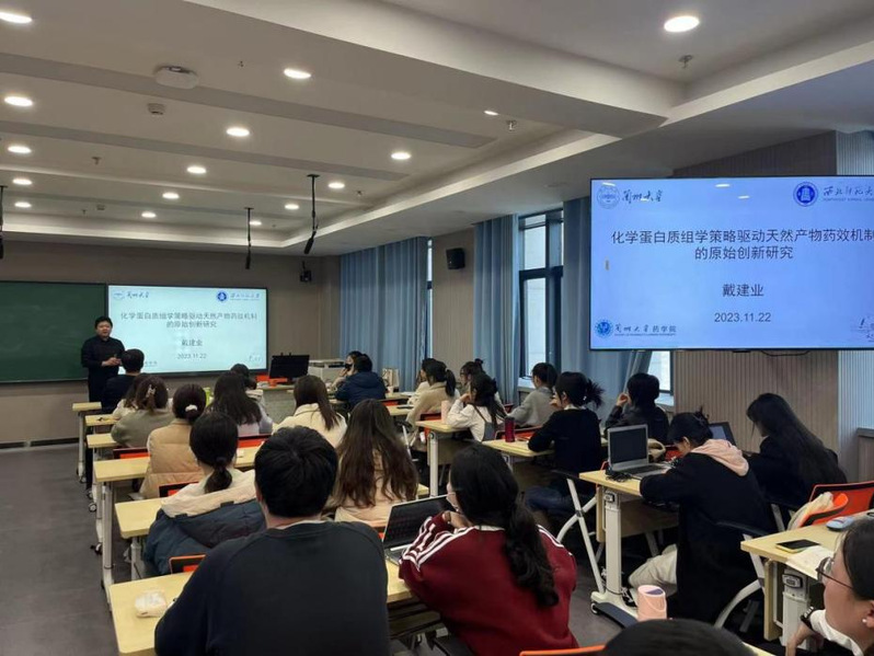戴建业教授作了题为“化学蛋白质组学策略驱动天然产物药效机制的原始创新研究”的学术报告。报告中,戴建业教授以黄芩素和藏药七十味珍珠丸为例,向在场师生系统地介绍了多组学技术在天然产物和成品药物抗癌中的药效评价体系,说明了多组学技术在药效评价中的优势。同时又在多组学技术的基础上结合代谢调控过程和蛋白功能表达两个方面介绍了天然产物针对癌细胞的精细药效机制和药效物质靶标注释过程。报告最后,戴建业教授对他的团队进行了简要介绍,并以师大校训、“路漫漫其修远兮,吾将上下而求索”鼓励在场师生。
