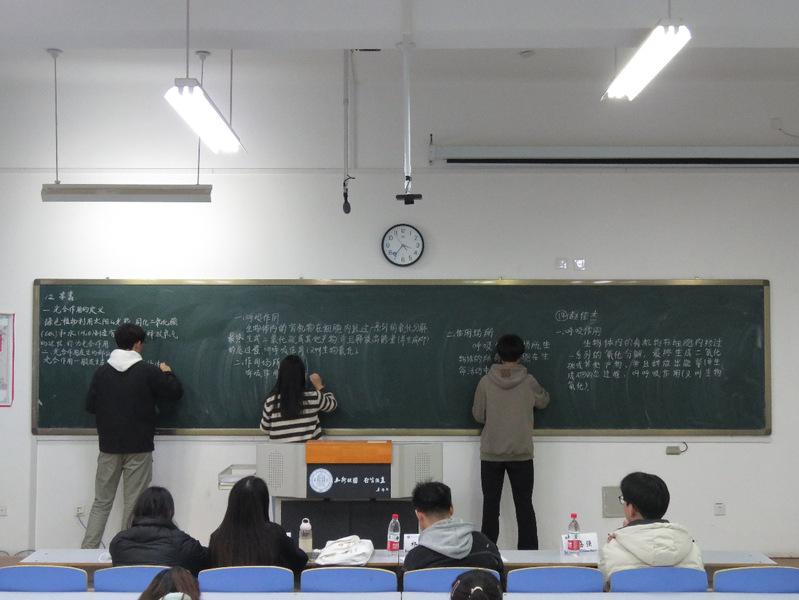本次大赛分钢笔、毛笔和粉笔三个项目。毛笔和钢笔分为初赛和决赛,评选方式由同学线上投票和老师线下打分两个环节;粉笔项目是在规定教室里,参赛选手在规定的时间里书写生物学科的规定内容。粉笔字书写现场,选手们优秀的作品吸引了一大群人驻足观看,只见那粉笔字笔锋犀利,遒劲有力,深浅不一的笔面犹如战马狂奔来回厮杀,时进时出。此次比赛共产生一等奖三名,二等奖四名,三等奖五名,优秀奖四名。