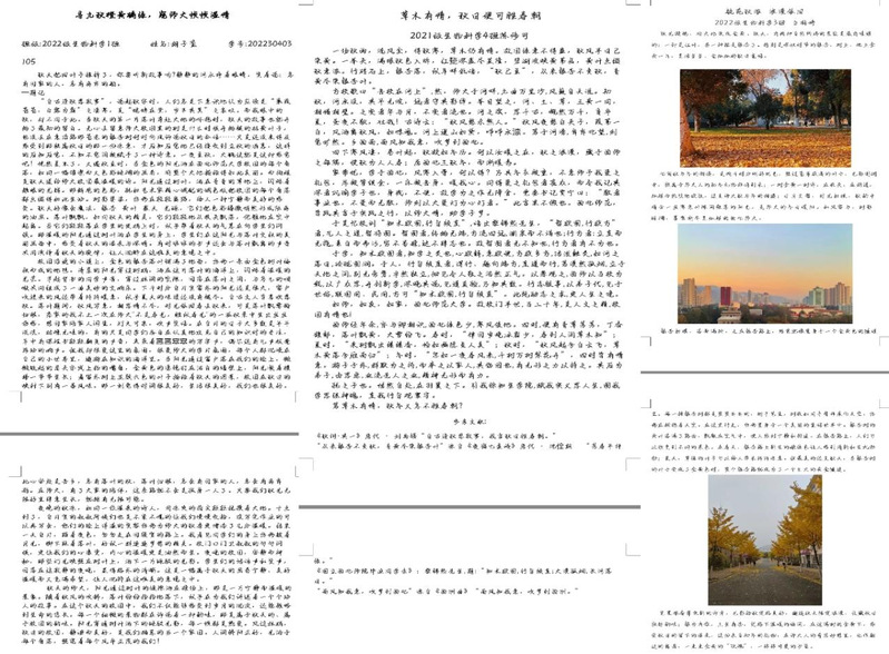 活动一拉开序幕,参赛征文稿便接踵而来,本次征文活动共收到征文作品65篇,涉及金秋美景、校园生活、校园文化等多个角度主题,涵盖散文、诗歌等多种文体,同学们围绕“寻九秋橙黄橘绿,窥师大帧帧温情”主旋律表达了各自的独特见解,真实反映了同学们对师大的热忱,文采斐然、字字珠玑。