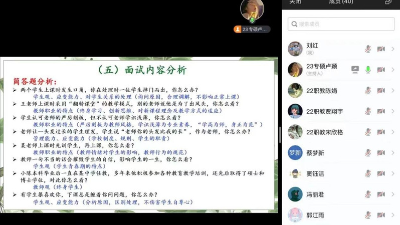 郝老师还指导了说课方法,从教材、教法、学法、教学程序四方面指导了说课的关键内容和设计方法,指出了提高说课质量的知识准备和能力训练建议。