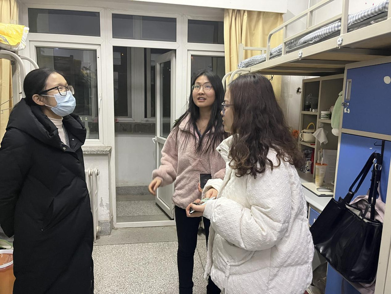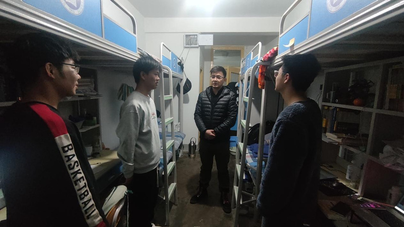 辅导员鲍海彤、唐井玉带队,逐一走访我院的本科生、研究生宿舍。本次检查主要针对宿舍卫生、用电安全,并细致地排查是否有大功率电器。同时,提示同学们元旦假期将至,注意出行安全,并鼓励同学们以积极的态度迎接期末考试。