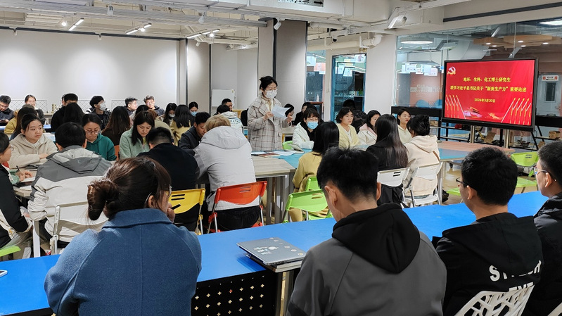为深入学习贯彻习近平新时代中国特色社会主义思想和全国“两会”精神,引导公司研究生进一步统一思想、凝聚共识,全方位、多角度把握时代精神,深入理解新质生产力的科学内涵和实践要义,3月20日上午,公司与地理与环境科学公司、化学化工公司在知行校区“棫檏苑”联合开展了“一站式”员工社区研究生集体联学习习近平总书记关于“新质生产力”重要论述活动。公司共有20余位博士研究生参加此次活动,员工社区党工委副书记牛定炜参加了会议。