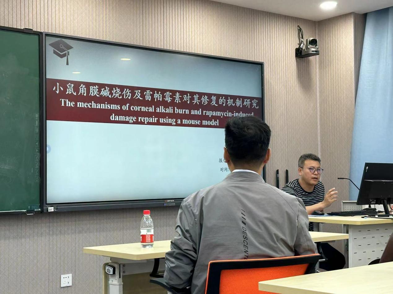 李建德副教授做了题为“小鼠角膜碱烧伤及雷帕霉素对其修复的机制研究”的学术报告。角膜对于保护眼睛、聚焦光线、传递营养物质以及维持视觉清晰度都至关重要,李建德副教授针对“碱损伤研究对象的选择”“碱损伤引起的角膜病变”、“参与炎症和免疫应答的关键调节因子”、“参与损伤和修复的信号通路和受体”等科学问题进行了深入探究;从基因表达的层面出发,以两个基因的甲基化位点发现了转录因子在角膜碱烧伤过程中的调控机制,并且介绍了哺乳动物中最关键的三个甲基转移酶发挥着重要的作用。