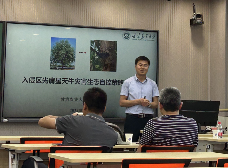 王立祥副教授的题目是:入侵区光肩星天牛灾害生态自控策略与技术。王老师从光肩星天牛的分布与危害、沙枣对光肩星天牛的诱杀功能、沙枣高效诱杀光肩星天牛的机制、生态自控光肩星天牛灾害的路径与实践等4个方面分享了光肩星天牛防治的漫长艰苦路程。他详细介绍了科研团队多年来在总结全国防治光肩星天牛理论成果和防治技术模式的基础上逐步形成了生态自控天牛虫灾的防治技术模式,为大家讲述了团队多年来如何领悟和践行着“将论文写在大地上”。报告尾声王老师与师生进行了许多趣味问题的探讨,极大地开拓了同学们对昆虫的认识。