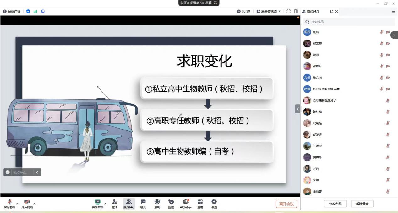 魏晗艳同学主要从简历制作、确立求职目标、选定目标城市等方面进行分享,并通过回顾自己的求职过程,着重介绍了考公考编的大体流程和注意事项,并为同学们分享了辅助选岗的软件。蒋芩结合自身应聘经验,从教招考情研究、搜集信息、试讲准备等多个方面进行了详细分析,并围绕职业技术教育专业,以深圳龙华区秋招岗位表(西安场)、东莞春招岗位表(本地场)为例,结合自身求职经历,分享了该专业可报考的教师岗位,鼓励同学们多尝试。范志俊根据自己的求职经历,提醒同学们在求职时要正确看待结果,保持平稳心态。王悦通过分享自己的就业故事,给同学们进行了就业建议,并建议同学们做好自我剖析,根据自身情况提早做好职业规划。
