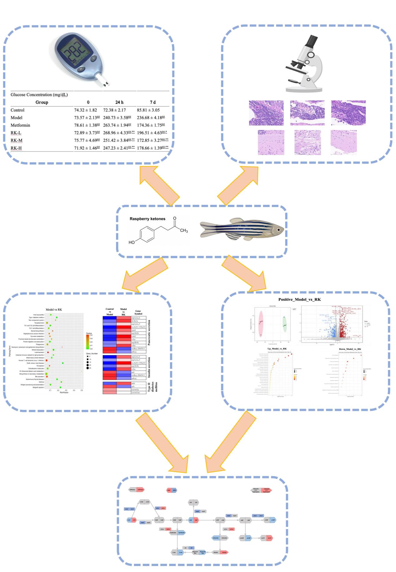 本研究通过构建斑马鱼高血糖模型,利用生化和病理检测明确了树莓酮对高血糖斑马鱼模型具有良好的保护作用,其中高血糖引起的胰岛、脑和其他组织损伤被不同程度的逆转,同时树莓酮也恢复了体重、胰岛素水平和摄食指标。其次通过多组学研究方法,发现树莓酮能够显著降低高血糖模型斑马鱼的胰岛素合成和胰腺分泌,并改变蛋白质和碳水化合物代谢。同时,树莓酮还可以预防高血糖导致的腺苷和鞘脂代谢等代谢紊乱。通过联合分析和验证实验,明确了嘌呤通路在树莓酮保护斑马鱼高血糖模型的中心地位,其中代谢产物积累和基因表达水平在树莓酮处理后表现出一致的变化模式。本研究为了解树莓酮的降糖机制提供了新的视角,且有助于建立基于斑马鱼的高通量降糖药物筛选模式。
