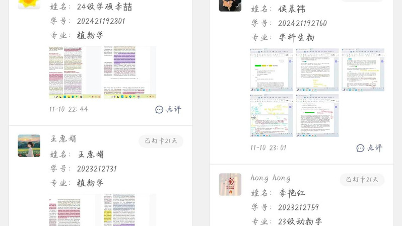本次活动内容丰富,分为必选与可选两大板块,必选项目紧贴研究生学术与生活实际,学术型研究生和生物与医药专业研究生需深耕文献,记录阅读心得;教育类研究生则以粉笔字为媒,记录每日进步。可选项目则涵盖英语、运动、阅读与朗诵,以21天为周期,通过连续打卡的方式鼓励研究生在自律的基础上,探索个人兴趣与潜能。这一活动不仅是对个人毅力与决心的考验,更是推动公司研究生教育质量全面提升、促进研究生学风建设的重要举措。