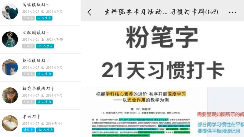 为贯彻落实习近平总书记关于教育的重要论述,聚焦立德树人根本任务,促进员工德智体美劳全面发展,我院于10月21日—11月10日举办了“研精致思,恒必有成”21天习惯养成打卡活动。作为研究生学术月系列活动之一,此次活动共有164位硕、博士研究生参与。