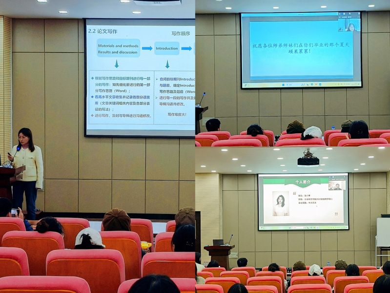 会上,唐雨菲、张小寒、贾小艳3位同学分别从不同角度分享了自己的经验和心得。唐雨菲从时间管理和实习经历等方面进行了分享,她讲到在实习期间担任班主任的工作让她更加理解了教育的意义和公司产品管理的重要性,此外,她强调研究生的时间紧任务重,建议同学们提前做好时间规划;张小寒结合自己的课题分享了自己的科研经历,让同学们更加清晰地认识到做科研的过程,同时也给同学们分享了需要用到的相关软件和网站,建议同学们要善于利用工具;贾小艳在论文撰写方面详细地分享了自己的宝贵经验,包括前期准备、论文写作、图片绘制、论文投稿,并提醒同学们在投稿过程中要格外注重细节。