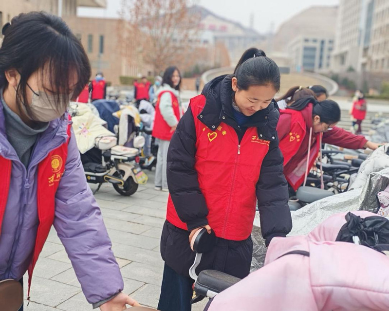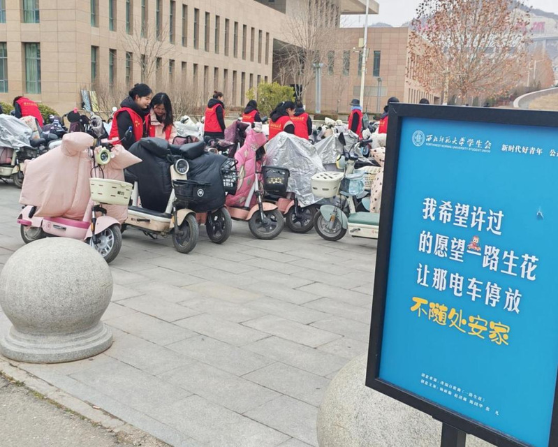 下午3时,志愿者们身着红色马甲,分组投入志愿服务。一组成员沿知行校区主干道细致清理路面及绿化带中的纸屑、烟头、塑料袋等垃圾,并对卫生死角进行重点清理。另一组成员则对校园内未规范停放的电动车进行统一规整,将车辆按标识线有序排列,同时张贴文明提示标语,引导师生养成规范停车的习惯。经过两小时的劳动,校园主干道焕然一新,文心楼前车辆摆放井然有序,志愿者的身影成为春日校园里一道亮丽的风景线。
