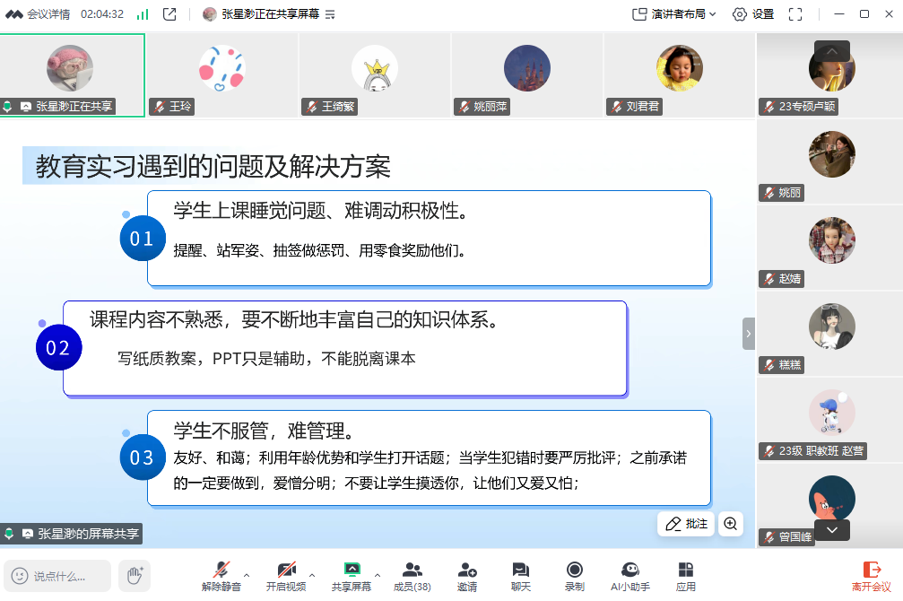 会上,11名同学代表从公司概况、工作内容、生活点滴、实习收获及反思不足等方面分享实习经历。姚丽同学称实习使她从初次试讲的紧张不安到能基本掌控课堂节奏;赵文丽同学表示实习让她对惊喜与挑战并存的职业教育充满期待。分享结束后,导师们对同学们的分享汇报进行细致点评。张世虎老师鼓励同学们带着问题去实习,以便准确高效地完成教育实习任务;张辉老师赞赏同学们的扎实准备,希望同学们经过全方位的培养训练后能更上一层楼;朱新亮老师则希望同学们主动与带教老师沟通,了解行业情况,完成身份转化并做好职业规划。