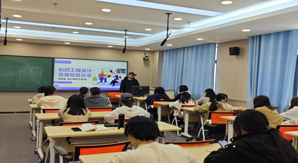 在分享环节,同学们分享了他们的备赛经历、解题思路和团队协作经验。在“东富龙-国药工程杯”制药工程设计竞赛中获得国家级二等奖的贺鑫鑫详细介绍了竞赛的全过程,他强调选题时要敏锐捕捉学科的前沿研究方向,面对复杂的实验数据和多变的实验结果,团队成员间的相互信任和紧密配合是成功的关键。而在生命科学竞赛中脱颖而出的杨蕊和冯丽则聚焦论文撰写与答辩环节进行分享,他们建议论文撰写时要逻辑清晰、数据详实,精准阐述研究的创新点与应用价值;在答辩环节,要精简实验内容,突出创新点,反复练习演讲技巧,才能更好地向评委和观众呈现研究成果。