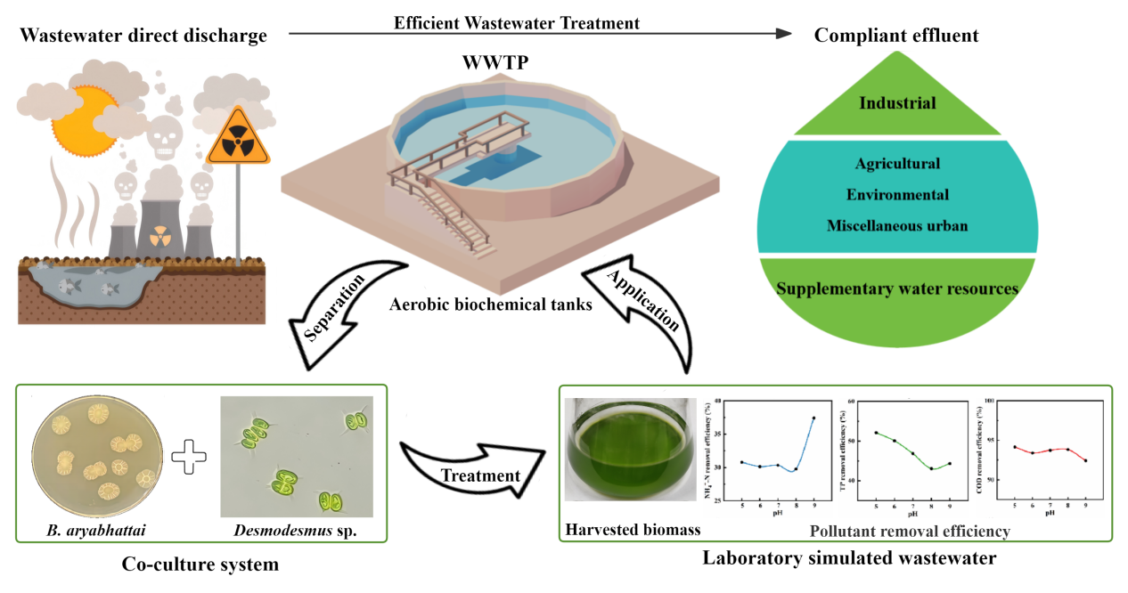 高氮磷废水未经处理直接排放容易造成水体和土壤污染、经济损失并危害人类健康。藻菌共培养体系已成为废水生物处理领域的研究热点之一。微藻通过光合作用释放氧气,细菌通过有氧呼吸为微藻的生长提供无机和有机化合物,从而在二者共生的基础上可进行高效废水处理。但目前对此共培养体系的研究不够深入,仍局限于少量物种之间。因此,论文“Construction of a co-culture system of Bacillus aryabhattai and Desmodesmus sp. and its performance in treating simulated wastewater with high nitrogen and phosphorus”利用从兰州兴蓉环境发展有限责任公司七里河安宁污水处理厂的好氧生化池内分离得到的耐受性强的优势藻菌种,构建了新型藻菌共培养体系,研究了其在高氮磷模拟废水中的生长特性和污染物去除效果。结果表明阿氏芽孢杆菌(Bacillus aryabhattai)可以促进微藻生长,而Desmodesmus sp.在模拟废水中的耐受性最强。最终,Bacillus aryabhattai-Desmodesmus sp.(Ba-Ds)共培养体系在藻菌比5:1、N/P6和pH7的条件下对废水中NH4+-N、TP和COD的去除率最为理想,分别可达30.60%、49.30%和93.73%。这些发现显示了Ba-Ds共培养体系在污染物去除能力上的提升,并展示了其在工业废水处理应用中的可扩展潜力,为藻菌共培养体系在实际废水生物处理中的应用提供了理论依据和技术参考。