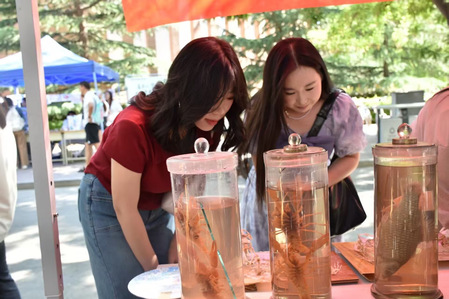 活动现场气氛热烈,吸引了众多师生驻足参与。在展示区,透明容器中陈列着形态各异的生物标本,从灵动的鱼虾到其他奇妙的生物,吸引了同学们好奇的目光,大家纷纷俯身仔细观察,与工作人员交流探讨。