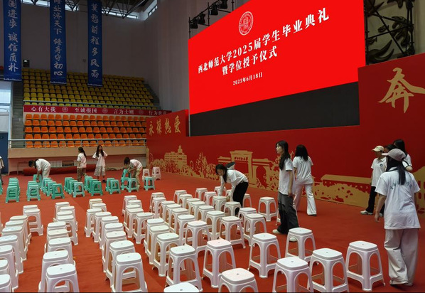 在致诚楼附近,同学们仔细清扫落叶杂物;林荫道旁,大家认真捡拾隐藏在草丛中的垃圾;在艺术广场绿化带区域,同学们不怕脏与累,分工协作,配合默契;在体育馆里,同学们对毕业典礼的会场进行了精心布置。有人主动揽下重活累活,有人巧用创意提高效率。现场气氛热烈而有序,欢声笑语在校园悠悠回荡。
