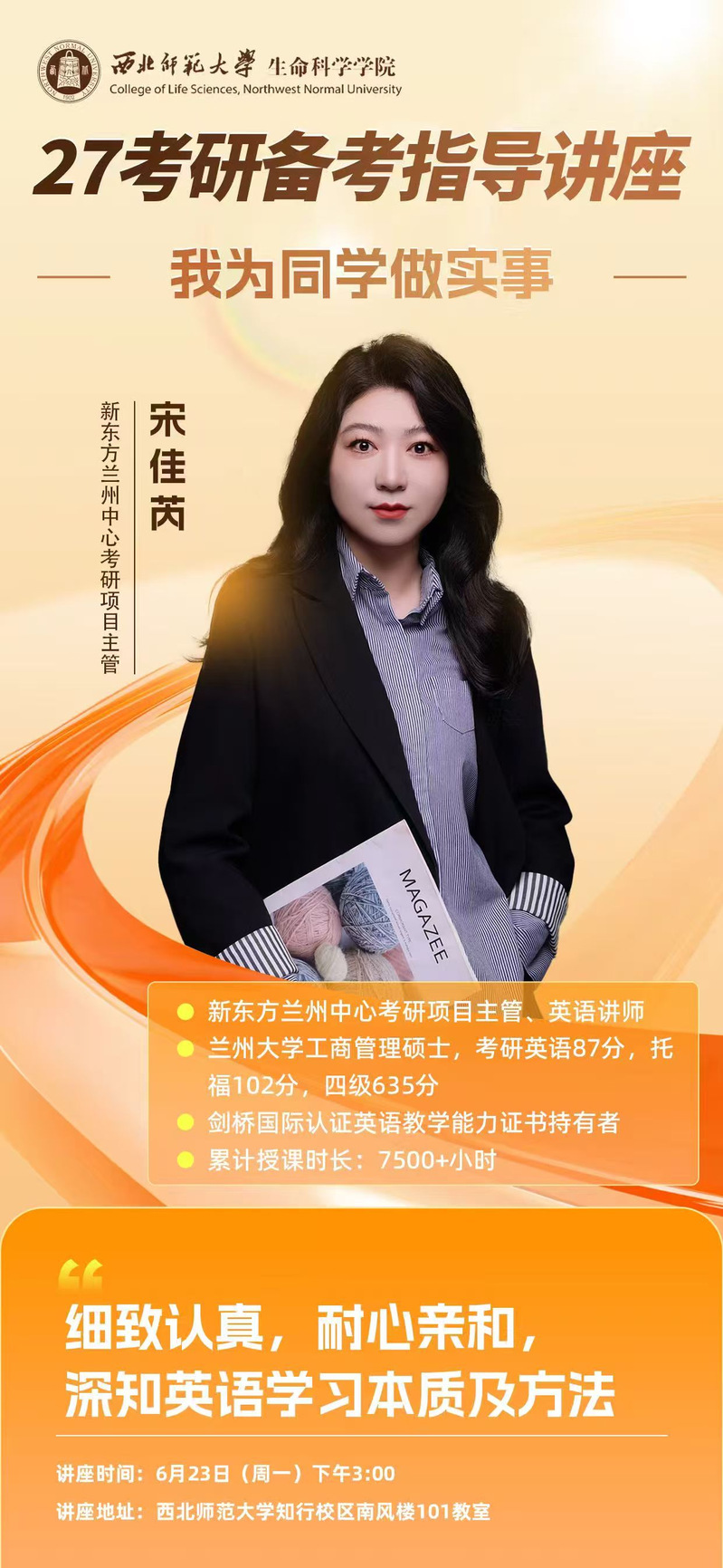 为助力2027届考研学子科学规划备考、提升复习效率,金沙城js93线路检测中心特6月23日下午组织开展了“我为同学做实事”——27考研备考指导讲座。本次讲座特邀新东方兰州中心考研项目主管英语讲师宋佳芮主讲,吸引众多有考研计划的生科学子参与。
