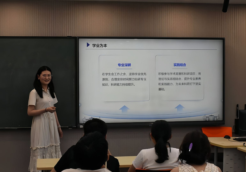 会议伊始,员工会主席石佳乐对过去一年工作进行总结,从学术交流活动的组织到志愿服务项目的落地,梳理工作成果与不足,同时向学弟学妹分享在员工会期间的成长感悟与工作经验,鼓励大家坚守服务初心,在传承中突破创新。随后,鲍海彤老师充分肯定团委、员工会过去一年的工作成果及认真负责的态度,强调成员应发挥朋辈引领作用,以更饱满的热情和更务实的行动,带动全院同学在学习与生活中勇毅前行。最后,各位竞选人依次进行竞选发言,纷纷表示将不断提升自身综合素质,强化工作能力,始终以积极的心态投入学习、生活与服务工作,传承员工组织的优良作风。